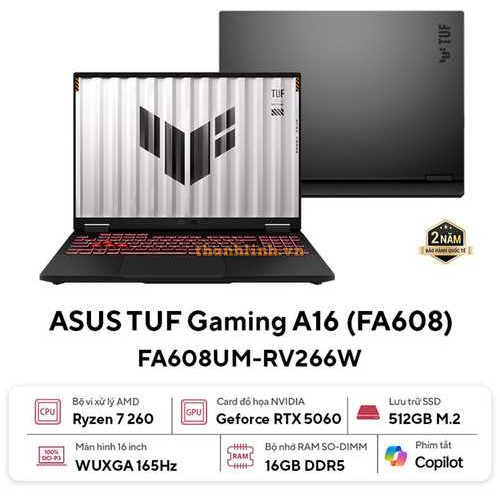 Laptop ASUS TUF Gaming A16 FA608UM-RV266W (AMD Ryzen 7 260 | 16GB | 512GB | RTX 5060 8GB | 16 inch FHD+ 165Hz | Win 11 | Xám)