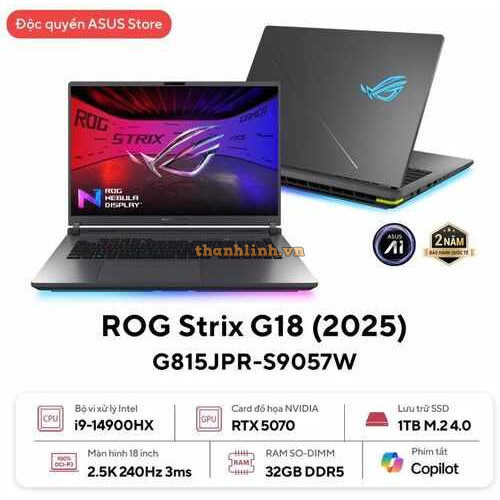 Laptop ASUS ROG Strix G18 G815LR-S9211W (Intel Core Ultra 9 Processor 275HX | RTX 5070 Ti 12GB | 18 inch 2.5K IPS 240Hz | 32GB | 1TB | Win 11 | Xám)