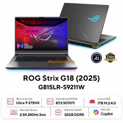 Laptop ASUS ROG Strix G18 G815LR-S9211W (Intel Core Ultra 9 Processor 275HX | RTX 5070 Ti 12GB | 18 inch 2.5K IPS 240Hz | 32GB | 1TB | Win 11 | Xám)