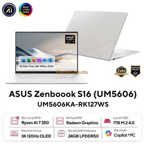 Laptop ASUS Zenbook S 16 UM5606KA-RK127WS (AMD Ryzen AI 7 350 Processor 2.0GHz | 24GB | 1TB | AMD Radeon | 16 inch 3K OLED | Win 11 | Office | Trắng)