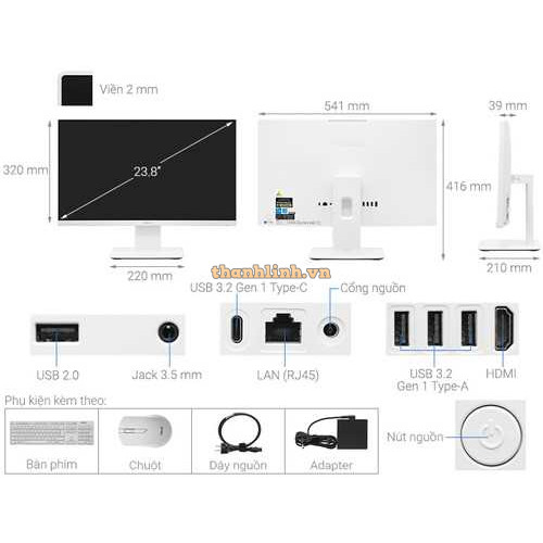 Máy tính bộ Asus M3400WU AMD Ryzen™ 3 5300U Mobile Processor (4-core/8-thread, 6MB cache, up to 3.8 GHz max boost)/8GB DDR4 SO-DIMM/512GB M.2 NVMe™ PCIe® 3.0 SSD/23.8FHD/TOUCH/1x Kensington lock,1x 3.5mm combo audio jack,1x USB 2.0 Type-A,1x DC-in,1x RJ45