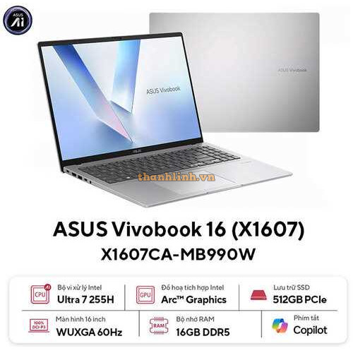 Laptop ASUS Vivobook 16 X1607CA-MB990W (Intel Core Ultra 7 255H | Intel Graphics | 16.0-inch WUXGA | 16GB | 512GB | Windows 11 Home SL | Bạc)