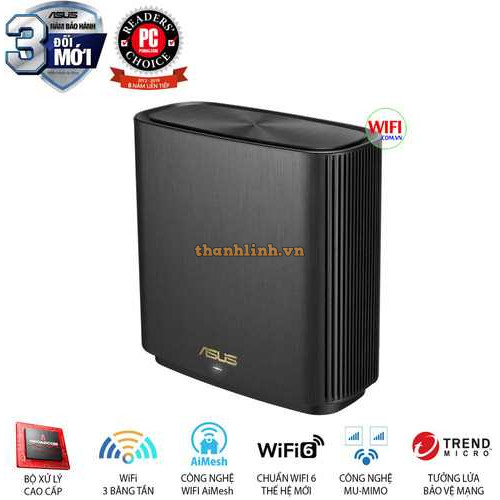 - Hệ thống WiFi Mesh nhanh nhất: 2 băng tần WiFi 6 dành cho thiết bị đầu cuối (574 + 1201 Mbps) và băng tần thứ 3 4804 Mbps dành riêng cho AiMesh (để kết nối các ZenWiFi AX với nhau).