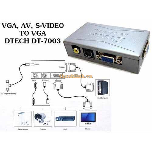 Bộ chuyển AV To VGA DTECH ( DT-7003 ). Hỗ trợ độ phân giải đầu ra. 800x600 @ 60Hz, 800x600 @ 75Hz, độ phân giải 1024x768 @ 60Hz. Hệ thống tiêu chuẩn PAL / NTSC. Màu sắc, độ sáng, độ tương phản, điều chỉnh độ bão hòa màu.t