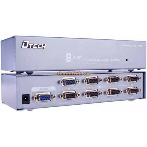 Bộ chia VGA 1 ra 8 chuyển tín hiệu từ 1 CPU / Máy tính / Laptop ra 8 cổng VGA cho LCD, TV, Máy chiếu... với băng thông rộng lên tới 250Mhz, độ phân giải màn hình Full HD 1920*1440 hỗ trợ tín hiệu đường truyền 20m - 40m