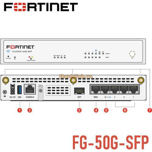 - Giao diện kết nối: 1 x USB Port, 1 x Console RJ45, 1 x GE SFP Port, 1 x GE RJ45 WAN Port, 1 x GE RJ45 FortiLink Port, 3 x GE RJ45 Ethernet Ports.