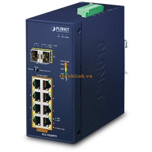 Bộ chuyển mạch Industrial 8-Port 1000T PoE + 2-Port 1000X SFP ( -40 75 độ C ) Planet IGS-1020PTF