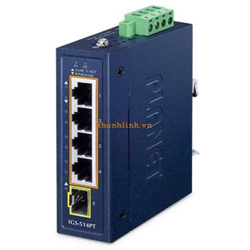 Bộ chuyển mạch Ethernet công nghiệp nhỏ gọn 4 cổng 1000T 802.3at PoE + 1 cổng 100/1000X SFP Planet IGS-514PT