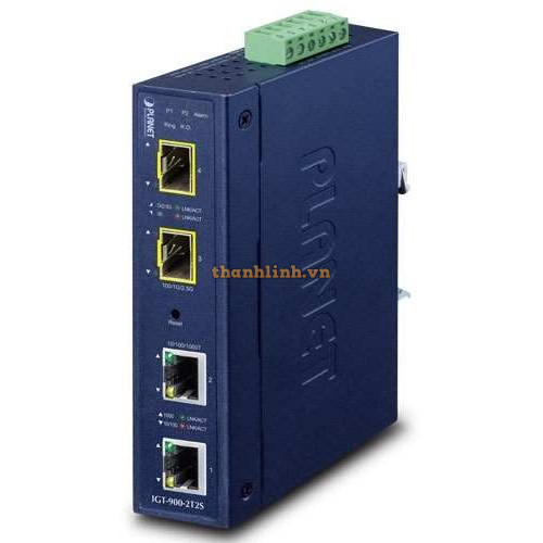 < p>-40 đến 75 độ C nhiệt độ hoạt độngBộ chia mạng Planet Industrial 2-Port 10/100/1000T + 2-Port 100/1000/2500X SFP Media Converter IGT-900-2T2S