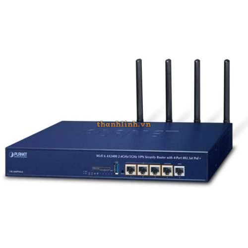 Thiết bị Bộ định tuyến bảo mật VPN PLANET Wi-Fi 6 AX2400 2.4GHz/5GHz Bộ định tuyến bảo mật VPN với 4 cổng 802.3at PoE+ (2400Mbps 802.11ax, 5 cổng 10/100/1000T, Ngân sách PoE 120W, Chuyển đổi dự phòng hai mạng WAN và Cân bằng tải, Bảo mật mạng, Tường lửa SPI, Lọc IPv4/IPv6, Lọc nội dung, Ngăn chặn tấn công DoS, SSL VPN và VPN lai mạnh mẽ (IPSec/GRE/PPTP/L2TP), IPv6, SNMP, PLANET Easy-DDNS, Tính sẵn sàng cao, Bộ điều khiển AP, Cổng bị khóa, RADIUS)