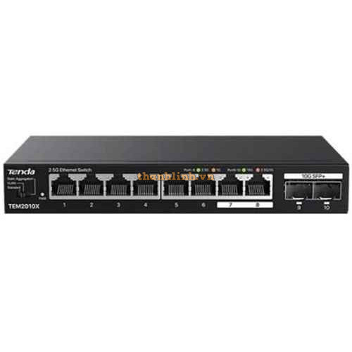 - TEM2010X là switch 2.5G 8 cổng, đi kèm 2 khe cắm 10G SFP+, được Tenda thiết kế để xây dựng hệ thống mạng tốc độ cao cho máy tính, NAS, TV box, Wi-Fi 6/7 APs và nhiều thiết bị khác.