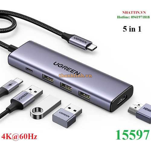 Hub chuyển đổi USB Type-C 5 trong 1 ra HDMI 4K@60Hz, USB-A x3, Sạc PD 100W Ugreen 15597 cao cấp