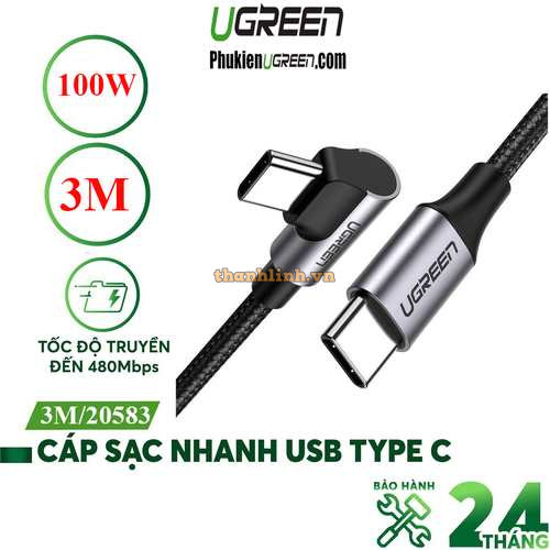Cáp dữ liệu, sạc nhanh 100W Type-C to Type-C bẻ góc 90 độ dài 3M Ugreen 20583 cao cấp