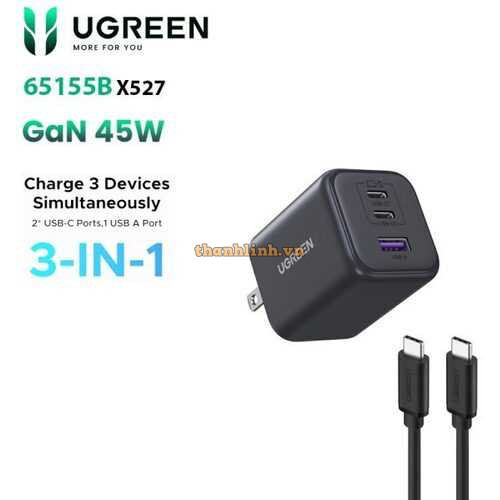 Củ sạc nhanh GaN 45W Ugreen 65155B X527, 3 cổng USB-C x2, USB-A Hỗ trợ QC4+, PD3.0 EU Plug