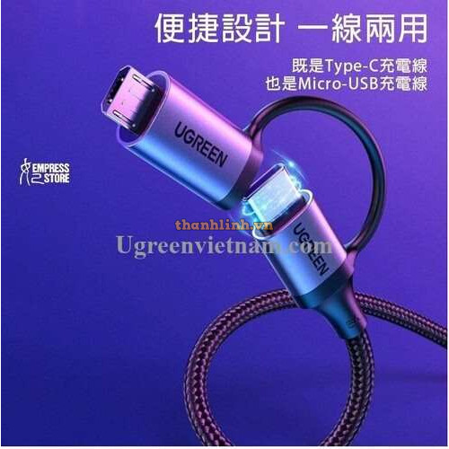 Thương hiệu: Ugreen2. Model: 70555 3. Danh mục: Cáp Sạc - Cáp Dữ Liệu4. Tính năng: cáp sạc, truyền dữ liệu 2 trong 1 dùng cho điện thoại, máy tính bảng Micro USB và USB Type C5. input: USB 2.06. Output: Micro USB x1, USB Type C x17. Chiều dài cáp: 1,5m8. 100g9. 20 x 15 x 3 cm