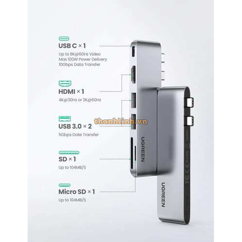 Hãng : Ugreen Mã SP : 80856 Đầu vào:USB Type-C x2 Đầu ra: :USB 3.0 x2, HDMI x1, SD/TF, USB Type-C HDMI:4K*2K/30Hz USB Type-C: Thunderbolt 3 hỗ trợ 8K@60hz, Sạc 100W, tốc độ 40Gbps Đầu đọc thẻ:Micro SD (TF)/SD 3.0