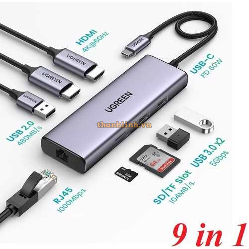 Thiết bị mở rộng 9 in 1 USB Type-C ra 2 cổng HDMI/USB/LAN Gigabit/PD 60W/SD/ TF Ugreen 90119 cao cấp