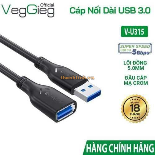 Cáp Nối Dài USB 3.0 Dài 1.5m VegGieg V-U315, Tốc độ 5gbps, dây nhựa PVC, mạ Crom