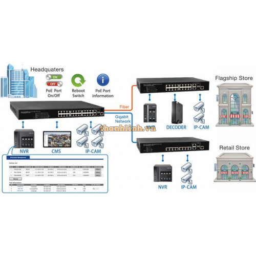 16-port Gigabit PoE+ Switch with ultra-high backplane capacity up to 32Gbps , công suất tối đa 250W , up to 30W mỗi port